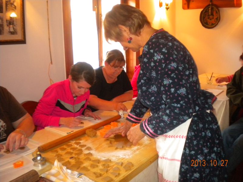 Másnap a gyakorlati képzés helyszíne a nádudvari Fehér Gólya Kézműves Udvar volt, ahol Pavluskáné Sulyok Júlia mutatta be a kézműves udvar működését és ismertette meg a hallgatókkal a természetes alapanyagokat használó hagyományos kézműves eljárások egyes formáit: a mézeskalácskészítés és –díszítés, valamint a nemezelés alapvető fogásait.
